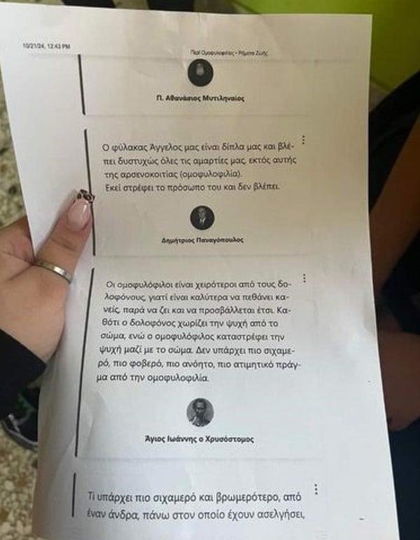 επειδή διένειμε στους μαθητές του φυλλάδιο με αποσπάσματα καταξιωμένων ορθοδόξων διδασκάλων με δριμύ κατηγορώ κατά της ομοφυλοφιλίας. Στο σχετικό ρεπορτάζ βλέπουμε ιερό Χρυσόστομο, π. Αθανάσιο Μυτιληναίο και Δημήτριο Παναγόπουλο.