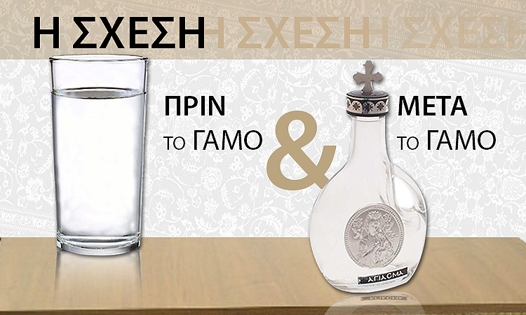 Στην δεύτερη εικόνα βλέπουμε το ίδιο νερό με τα ίδια συστατικά (Η2Ο) αλλά πλέον κάτι φοβερό και συγκλονιστικό έχει συμβεί.  Ήρθε ο Χριστός και πήρε την φθορά και τον θάνατο. Πλέον το νερό δεν είναι ένα συνηθισμένο νερό αλλά ένα αγιασμένο νερό. Πλέον η χρήση του είναι διαφορετική έχει άλλη πορεία, έχει άλλο σκοπό , στόχο και ολοκλήρωση. Πλέον η πόση του συγκεκριμένου νερού δεν είναι μόνο για να ξεδιψάσει το σώμα αλλά για να τραφεί η ψυχή με ένα στοιχείο του παραδείσου. Για αυτό έχουμε το νερό πριν γίνει αγιασμός και το νερό αφού γίνει αγιασμός. Ετσι έχουμε και την σχέση χωρίς τον Χριστό (προγαμιαία) και την σχέση με τον Χριστό στο Ιερό Μυστήριο του γάμου.