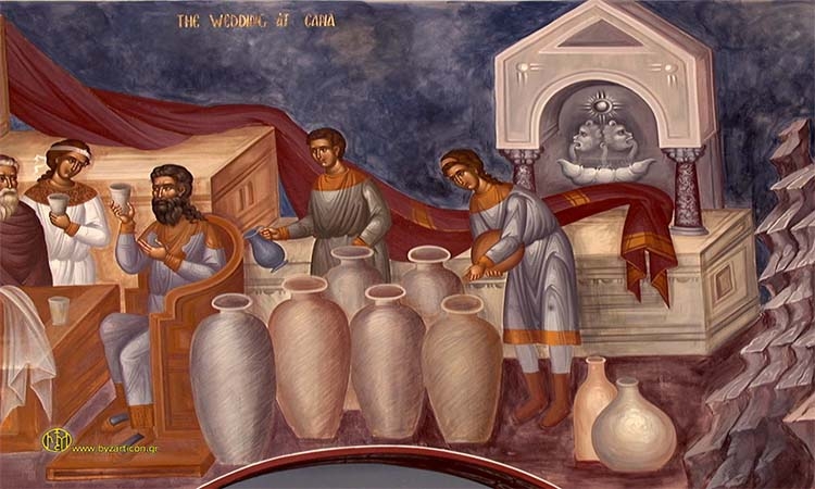 Το ευαγγέλιο του γάμου (από το κατά Ιωάννην, κεφ. 2) διηγείται το πρώτο θαύμα του Χριστού, που έγινε σ’ ένα γάμο στο χωριό Κανά, όπου ήταν καλεσμένος μαζί με την Παναγία, τη Μητέρα Του. Εκεί, κάποια στιγμή, τελείωσε το κρασί και ο Χριστός, μετά από παράκληση της Παναγίας, έκανε το νερό κρασί, και μάλιστα καλύτερο από το προηγούμενο κρασί του γάμου. Το θαύμα αυτό φανερώνει πως ο Χριστός είναι που δίνει αληθινή ποιότητα και γεύση στη ζωή μας, αρκεί να Του το επιτρέψουμε. Χωρίς Αυτόν, το «κρασί» της ζωής μας – δηλαδή η αγάπη – κάποια στιγμή τελειώνει. Εκείνος όμως παίρνει το «νερό» που έχουμε μέσα μας (δηλαδή τις μικρές μας δυνάμεις, τα αδύναμα συναισθήματά μας) και το κάνει κρασί, δηλαδή αυξάνει την αγάπη μας συνεχώς, όσες δυσκολίες κι αν έρχονται.